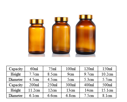 These amber glass pill bottles feature a wide mouth design for easy filling. The amber glass body provides UV protection for medications. We have brown glass bottles in different capacities from 60ml to 500ml, they can store different medications. They are large enough for extra large pills, like multivitamins or gummies.