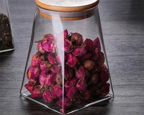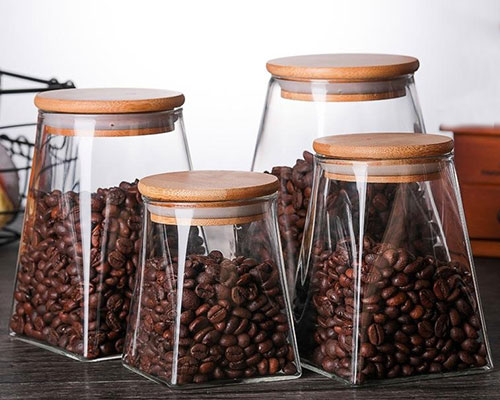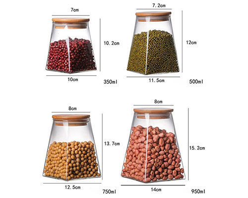 The best glass jars for food storage feature creative square clear glass, all four sides are an isosceles trapezoid. The bottom of the clear glass jar is square in a larger size, and the round top is just sealed with a bamboo wood lid. For the square clear glass jars for food storage, we have four sizes to choose from 12oz, 16oz, 25oz, and 34oz.