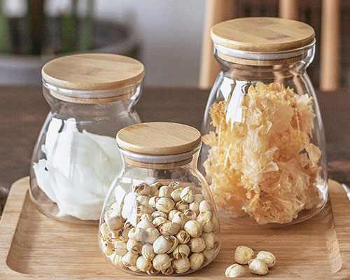 These borosilicate glass jars with bamboo lids come in 3 sizes with capacities of 500ml, 750ml, and 1100ml. Glass storage jars of different sizes can meet different storage needs, bringing convenience to kitchen storage and saving space. The rounded bottom arc design of the glass jar makes the storage bottle more tasteful.