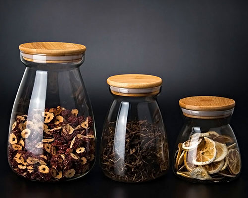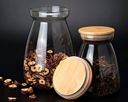 Yafu Glass offers borosilicate glass jars with bamboo lids in different shapes, such as round and square glass jars.
