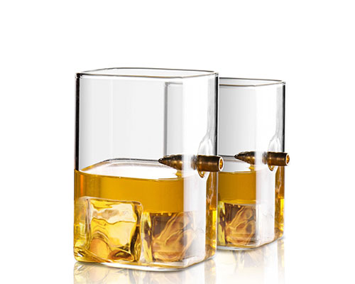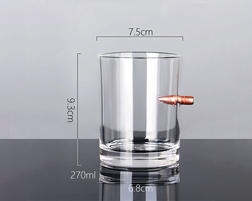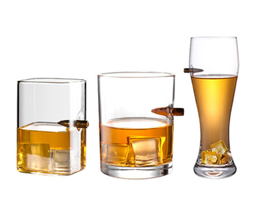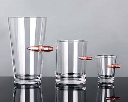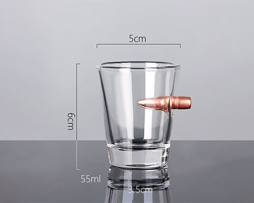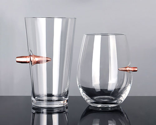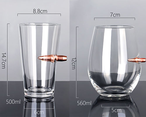 The bullet shot glasses have a unique design that combines fragile glass with hard bullets. A bullet is blocked by the flimsy wall of the glass, giving it a cool appearance. The bullet can used as a handle to easily hold the wine glass.