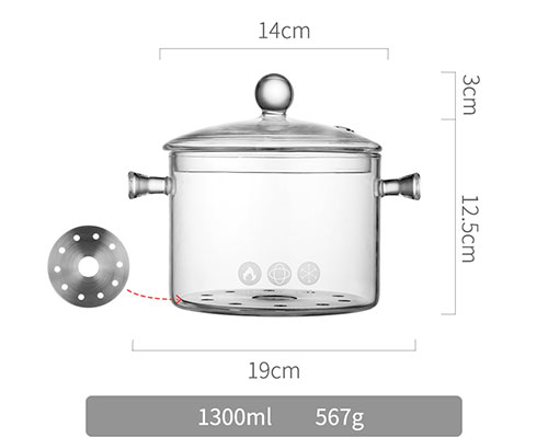 We have three capacities of Best Borosilicate Glass Cookware to choose from: 1.3L, 1.5L, and 2L. Double handle design to prevent hot hands, and the comfortable grip makes it easy to pour out food.