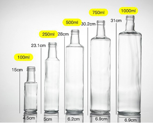 The clear glass olive oil bottles adopt a straight round design. We have 100ml, 250ml, 500ml, 750ml and 1 liter capacity to choose from. We also provide a variety of styles of sealing caps to provide a delicate sealing effect for olive oil packaging.