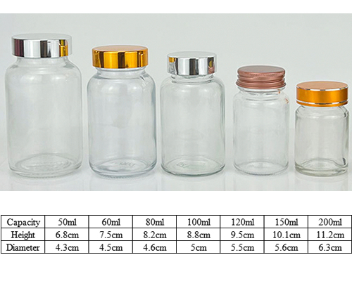 The clear glass pill bottles are available in a variety of capacities from 50ml to 200ml. Each glass bottle is securely closed with a metal screw cap. These caps are lined with a sealing liner to prevent leakage and maintain the freshness of the contents inside.