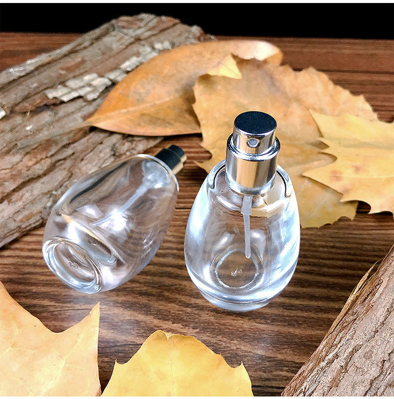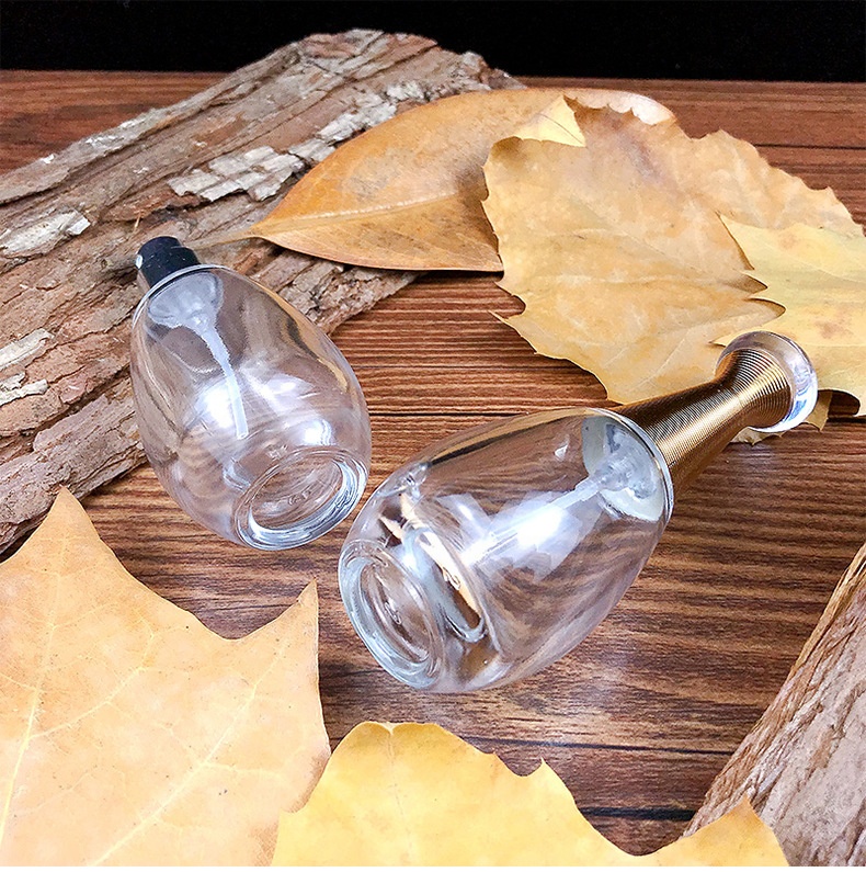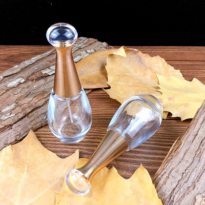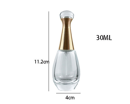 The clear perfume bottle has an oval shape. The capacity is 30ml. The material is glass + plastic cover. The seal is a pump sprayer type. The slender neck is elegant and charming, and it is surrounded by a golden scarf for a week, and the perfect curve is even more noble.