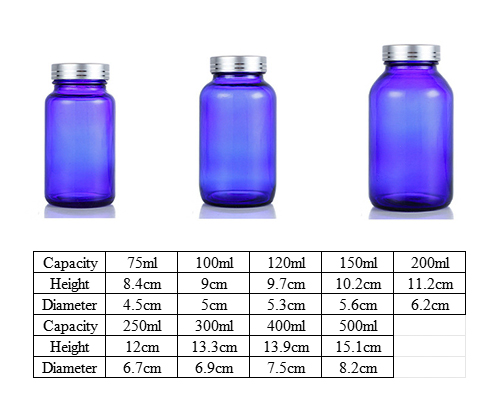Like amber glass pill bottles, blue glass bottles can provide moderate protection to tablets by absorbing UV light. This is the main reason why cobalt blue glass bottles are widely used. They can also give a unique and sophisticated look to the product, making it stand out on the shelf.