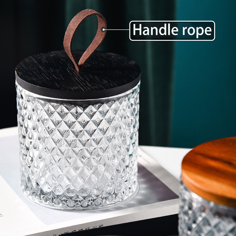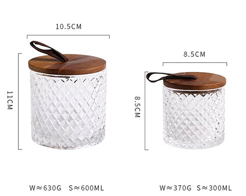 The crystal glass jar capacity is 300ml and 600ml. The wooden lid with handle rope is easy to open. Beautiful glass bottles can store cookies, scented tea, etc…