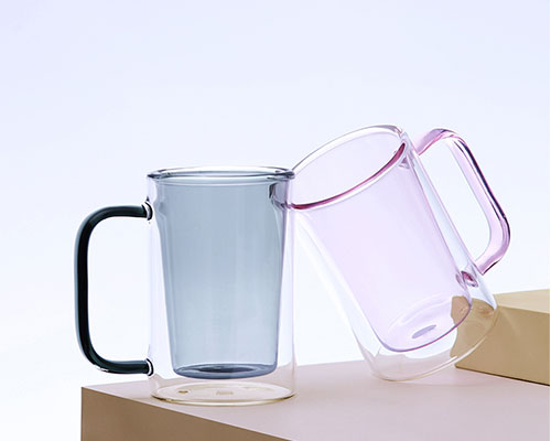 We offer these colorful double glass cups with handles in different colors: Pink, Blue, Green, Gray, and Brown. There are two different capacities: 230ml and 300ml.