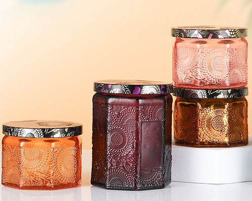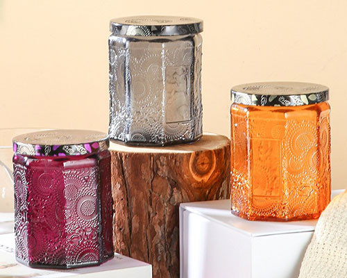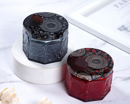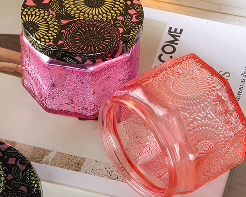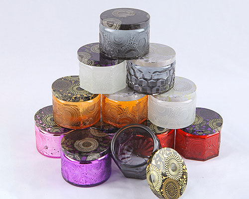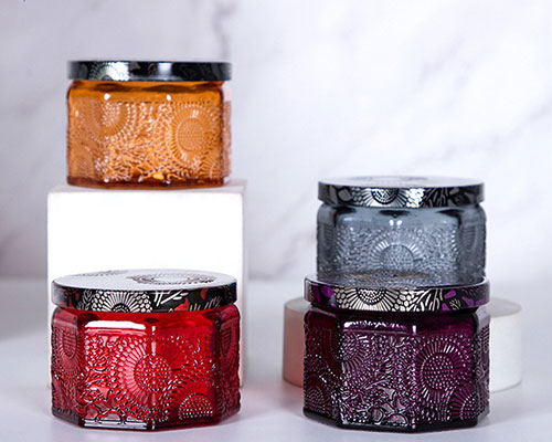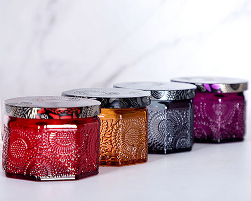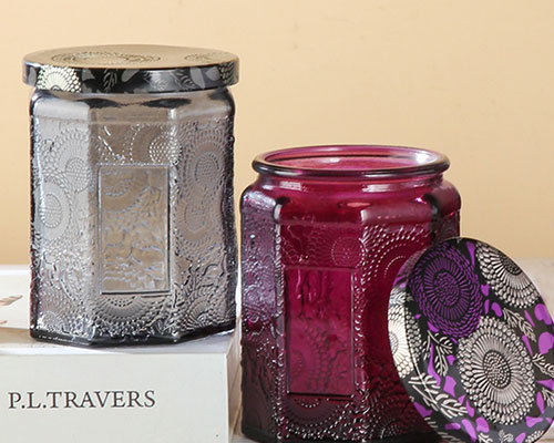 We have hexagonal embossed candle jars in various colors, pink, red, grey, blue, and purple. Each embossed glass candle jar is matched with a metal lid of the corresponding color and pattern.