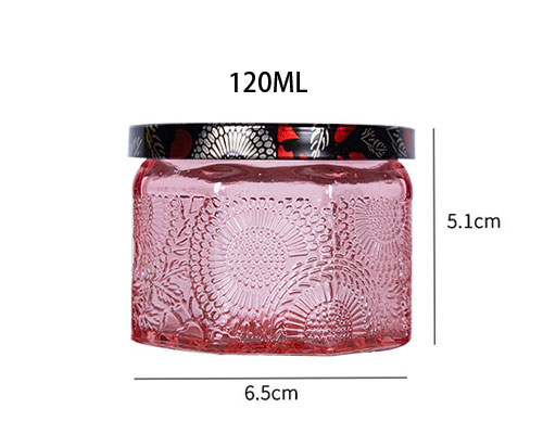 The embossed candle jars with metal lids feature a hexagonal design and a 120ml capacity. The glass jars use a unique embossing process to present a beautiful sunflower pattern. These glass candle containers feature thickened bottoms and walls that are heat-resistant, sturdy, and reusable.