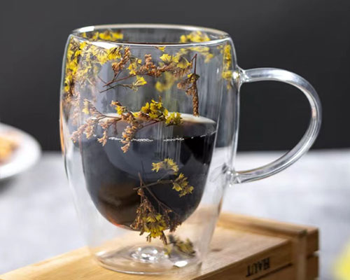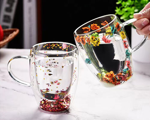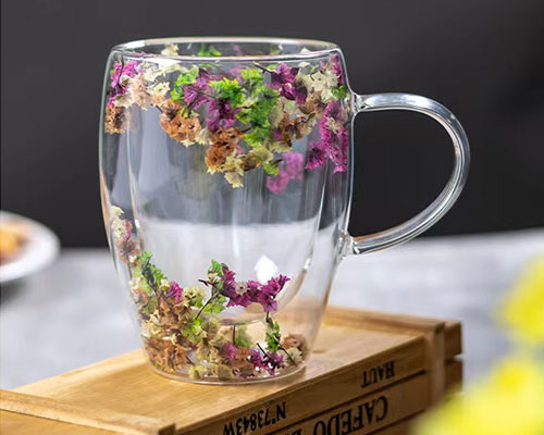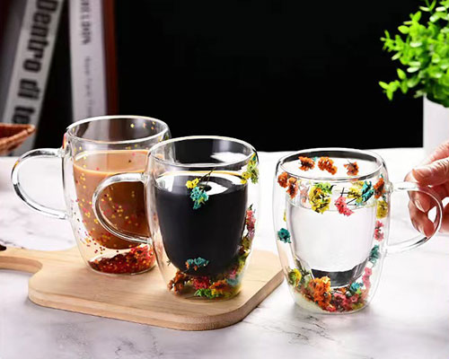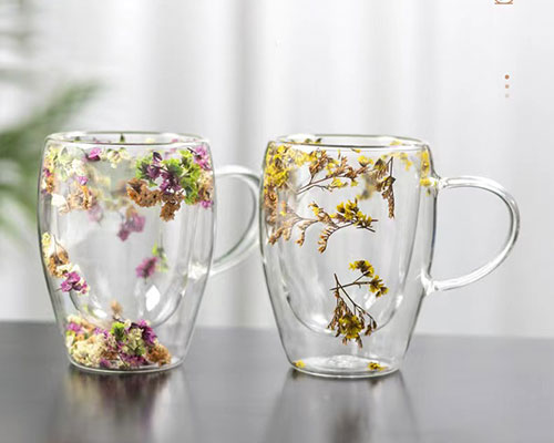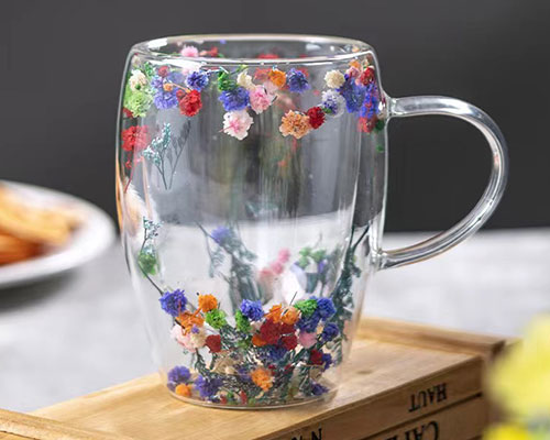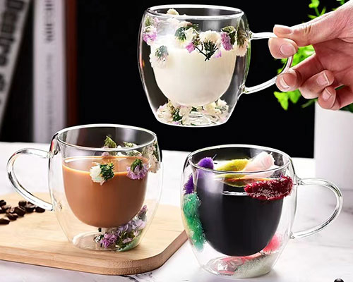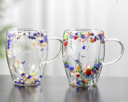 The flower glass cups feature a unique double-layer design with beautiful dried flowers inside. We have heat-resistant double wall glasses in 250ml and 350ml capacities.