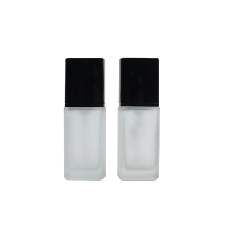 The foundation pump bottle is made of frosted glass, is square, and has a capacity of 30ml. Surface handling adopts hot stamping. Available colors are white, pink, and black. The size is 105mm*37mm.