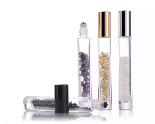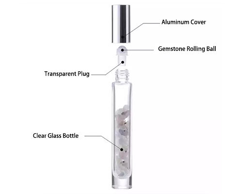 Gemstone roller bottles consist of gemstone roller tops, clear glass bottles with crystal power stones and lids. These 10ml glass roller bottles can be taken anywhere, and are perfect for using essential oils, perfume oils, restoratives, DIY sample mixes, serums, aromatherapy, and other liquids.