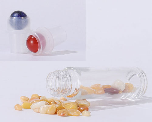 Each clear glass bottle comes with a roll-on top made from gemstones, and is available in a variety of colored caps. Each gemstone roller ball is polished and smooth. The rolling gemstone balls are evenly oiled and will not snag or fall out.