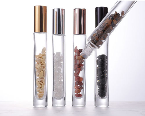 Yafu Glass is a glass bottle and glass jar manufacturer, we offer wholesale gemstone roller bottles in different sizes and covers. The transparent glass bottle with colorful gemstones gives the essential oil roll-on bottle a clear aesthetic and creates a trendy style
