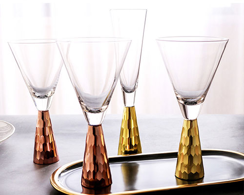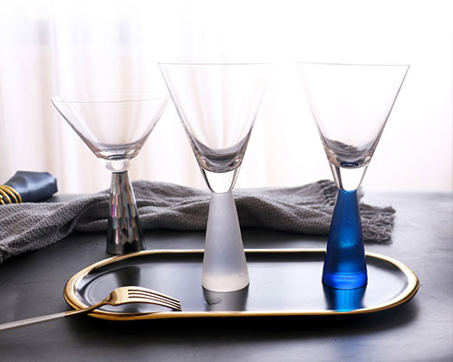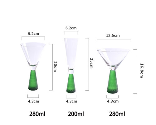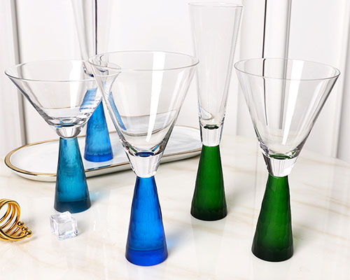 We produce and wholesale cocktail glasses in various colors: transparent, blue, green, gold, and silver. Glass stemware holds 200ml and 280ml drinks. The color stems decorative design and crystal clear base make it unique.