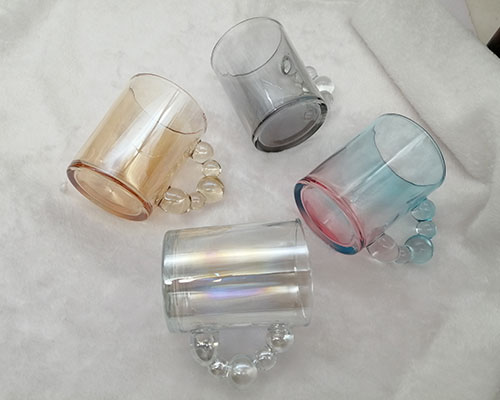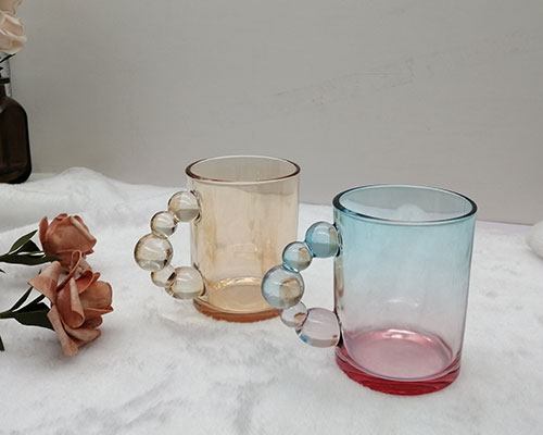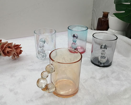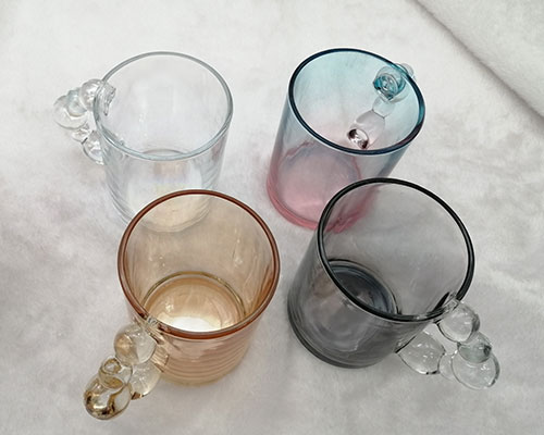 The glass tumblers with handles have a simple wide mouth and a solid base, and the handle is perfectly balanced with the heavy base construction.