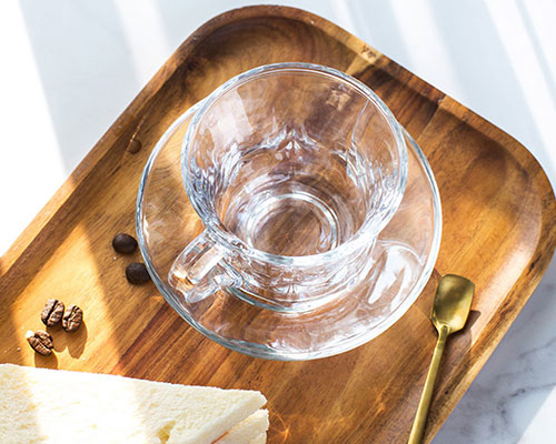 Clear glass mugs with handles feature sturdy construction and a creative design. The pattern on the glass pan echoes the pattern on the glass mug. Crystal clear structure for excellent content visibility. The engraved texture on the surface of the glass cup makes it unique and beautiful.