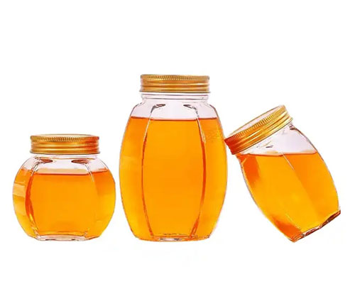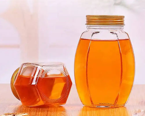 The glass honey containers are pot-bellied hexagonal glass bottles. Each clear hex glass jar comes with a metal lid, so as to ensure a good seal and prevent leaks. This pot-bellied hexagonal glass honey jar is perfect for storing honey, spices, donkey-hide gelatin, chutneys, jams, and more.