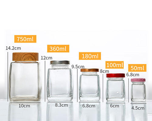 The square glass honey jars for sale are available in sizes from 50ml to 750ml. The square honey jar is made of thick glass, making it sturdy and durable. Clear glass bottles display honey beautifully. Each honey glass jar has a screw-on lid to ensure a good seal and prevent leaks. These glass jars are perfect for storing jam, honey or candies.