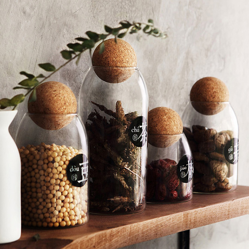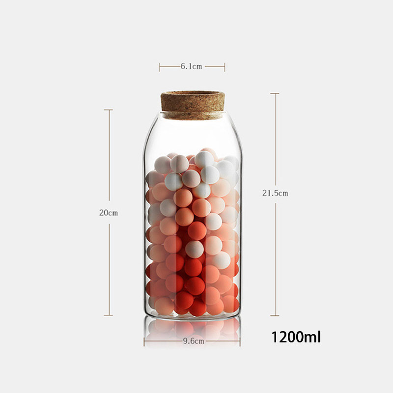 Glass Jar With Cork Lid is made of borosilicate glass, the crystal clear glass allows you to easily monitor when your food is running out. Glass bottles with cork lids serve not only as useful containers but also as decorations. Its stylish see-through design makes it more visually appealing. The design of the cork lid adds artistic beauty and is convenient for storing various nuts and beans.