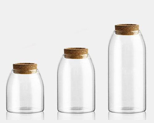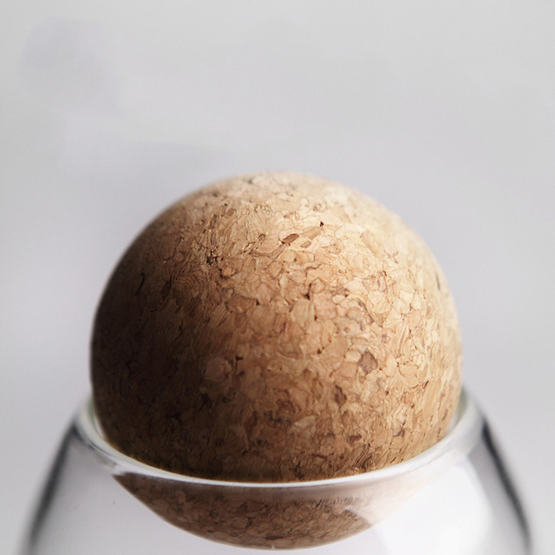 This glass jar with cork lid is available in three volumes: 500ml, 800ml, and 1200ml. We offer two different styles of Glass Jars With Cork lids: Cork Ball Glass Jar and Glass Jar With Round Cork Lid.