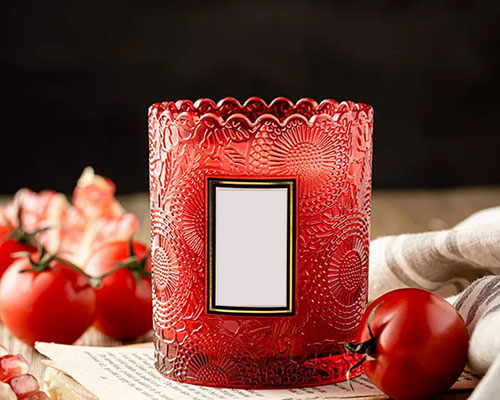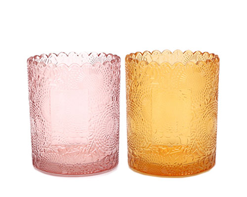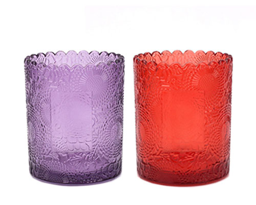 We have this embossed glass candle holder available in four colors: red, orange, pink, and gray. The embossed glass candle jar can be used as an ornament for home decor. These candle containers feature thickened glass bottoms and glass walls that are heat-resistant, sturdy, unbreakable and reusable.
