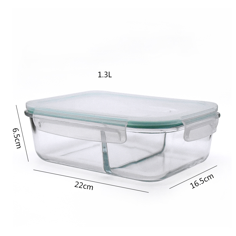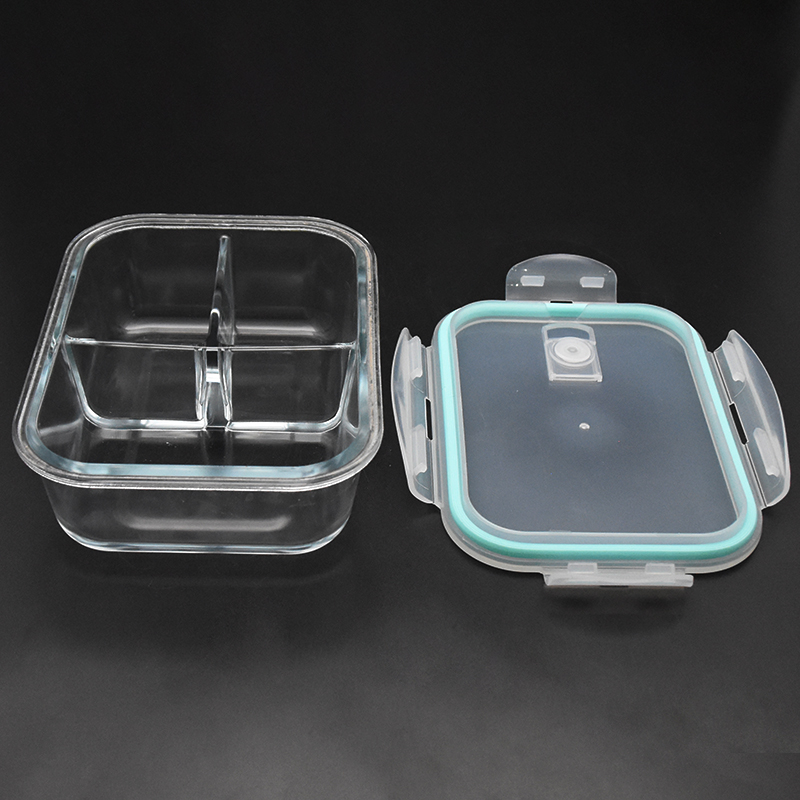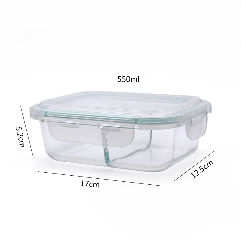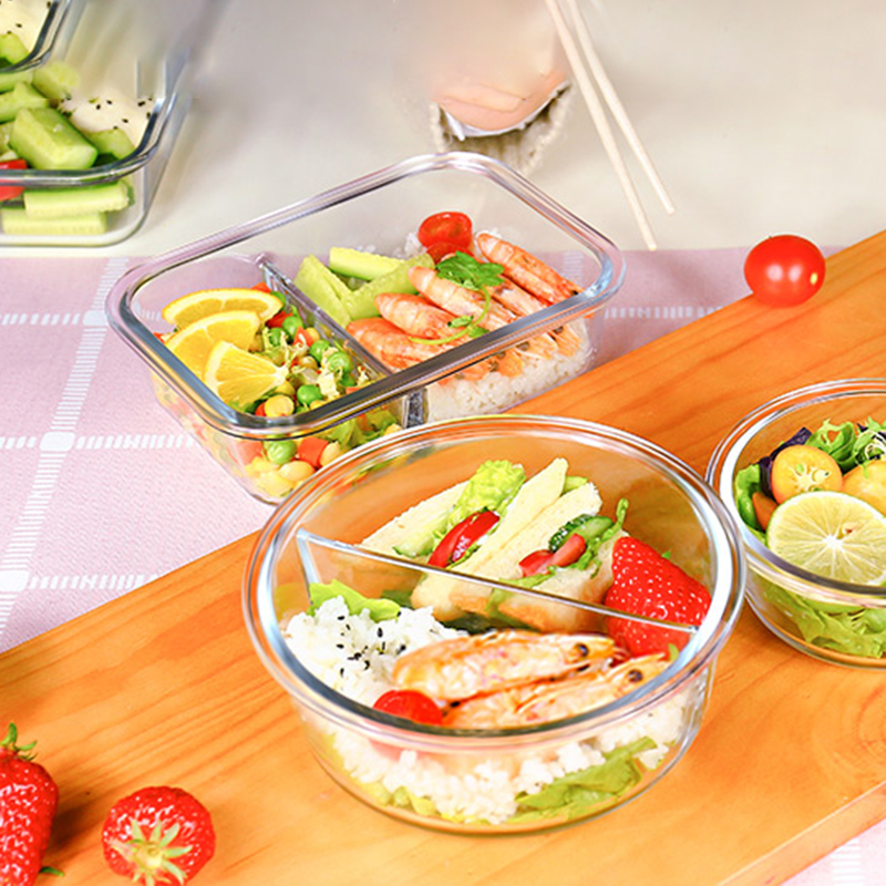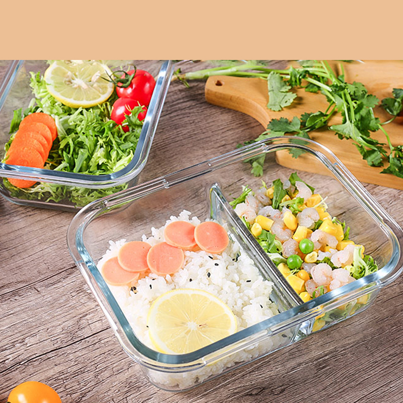 Glass lunch box food containers are available in 300ml-1200ml capacities. The glass is easier to clean and heated directly by microwave. Large-capacity glass lunch boxes use glass dividers to separate different foods. Airtight lids help food store better in the refrigerator.