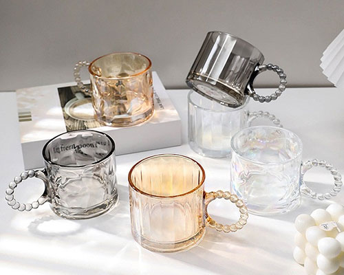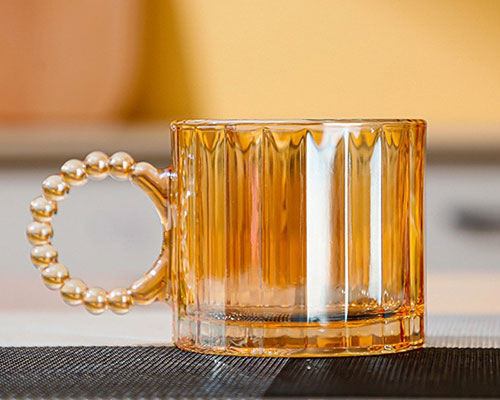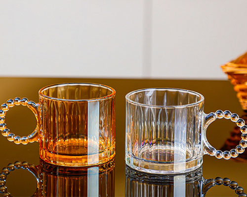 The 300ml colorful glass mug with handle has a creative luxury pearl handle, and the glasses come in a variety of color options. The glass is made of creative stripes, which is more beautiful, and the large round handle is comfortable to hold and has an excellent appearance.