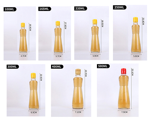 The glass oil and vinegar bottles adopt a unique waist design and are equipped with a flip top for easy use. We have empty glass bottles in various capacities, 100ml, 165ml, 220ml, 250ml, 300ml, 400ml, and 500ml. They can be used to hold a variety of liquid condiments, such as soy sauce, vinegar, cooking oil, and wine.
