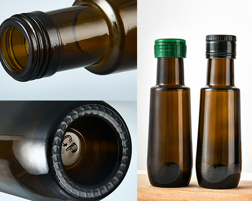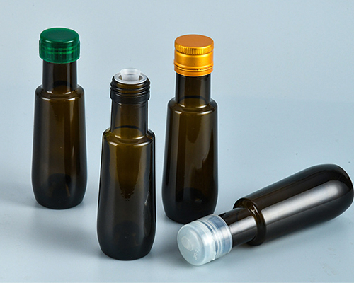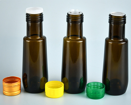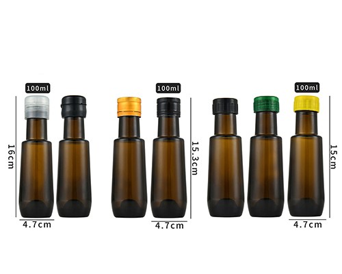 100ml small glass olive oil bottles bulk are made of high quality glass, dark glass bottles avoid direct light to the olive oil. They come with flip top, aluminum and plastic screw caps in different color combinations.