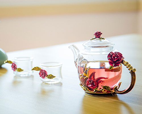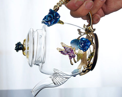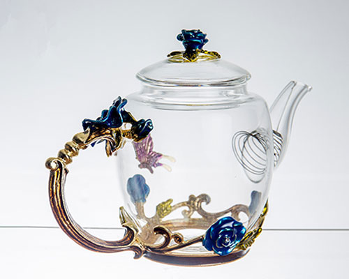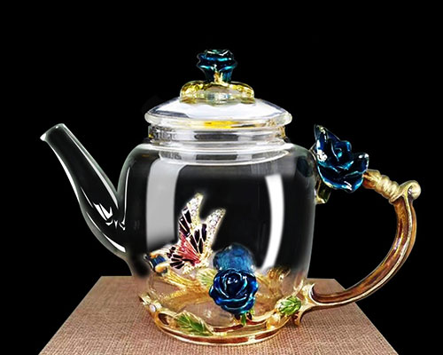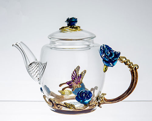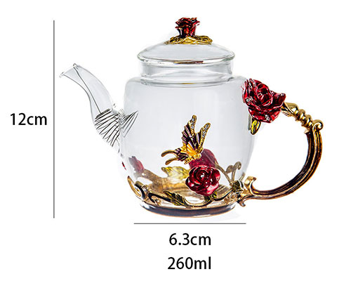 The three-dimensionally carved roses are vivid, as if growing on the wall of the glass teapot. The sculpted butterflies come to life, echoing the roses. The glass jug handle is exquisite, like a rose vine, which is perfectly connected to the teapot.