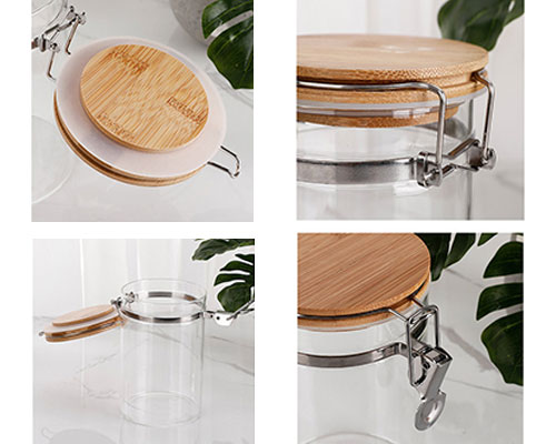 The glass storage jars with clamp lids are equipped with bamboo lids with silicone sealing rings. They can be easily disassembled, effectively preventing moisture and preventing odor. The sealing lid has a locking clip and a silicone sealing ring, and the silicone sealing ring acts as a seal to keep the food in the glass jar fresh.