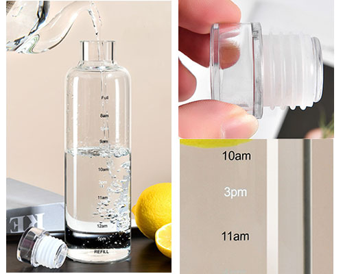 The glass water bottle with time markings can hold 500ml liquid, and can meet daily hydration needs. The glass lid contains a silicone stopper to prevent water from leaking, making it perfect for juice, lemonade, water, milk, and tea.