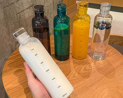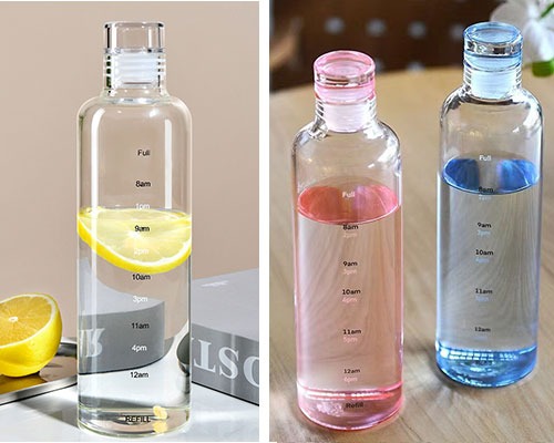 Time markings on glass water bottles will remind you to drink the recommended amount of water throughout the day. Just fill the bottle and drink every hour to mark the timeline. Refill the glass bottle at noon and reuse it.