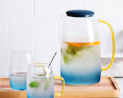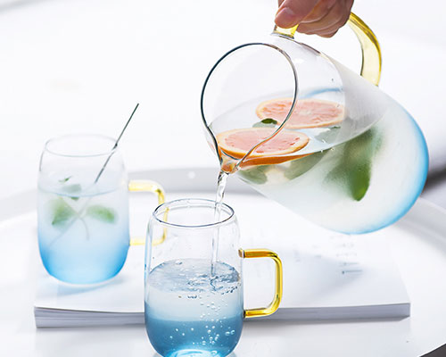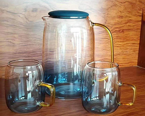 Yafu Glass is a glassware manufacturer, we offer 280ml glass cups with handles for this blue glass water jug. This borosilicate glass water jug with lid and glasses can withstand temperatures between -20°C and 130°C.