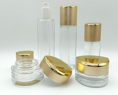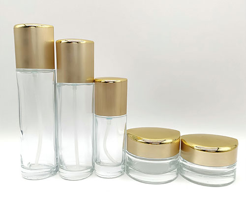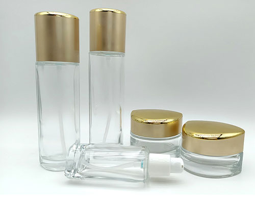 The gold cosmetic packaging includes 40ml 100ml 120ml glass pump bottles and 50g 30g cosmetic jars with gold lids. These glass jars with gold lids can be used to portion out creams, lotions, skin care products, moisturizers, or other cosmetics.