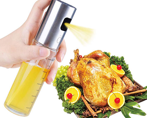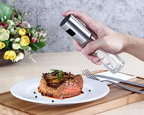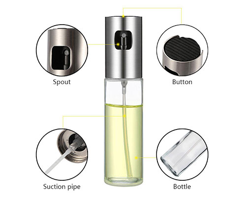 The gourmet olive oil sprayer is made with a glass body and a high-quality stainless steel lid.