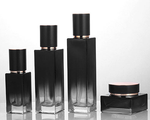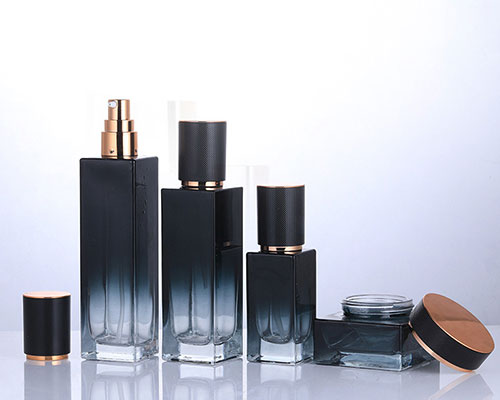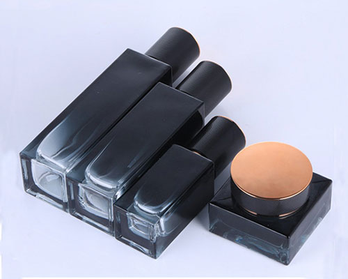 The black glass cosmetic packaging adopts a square bottle design, and the gradient black glass body and gold rim cap makes the glass cosmetic bottle look beautiful and high-end. The black lid and the glass bottle are integrated into one body, like splashes of ink pouring down from a high place. It is mysterious and dangerous, attracting people to want to find out.