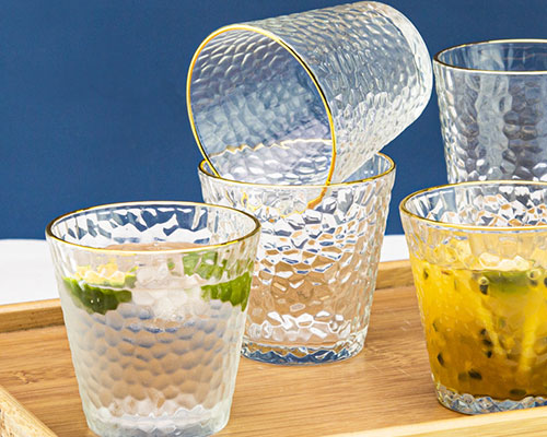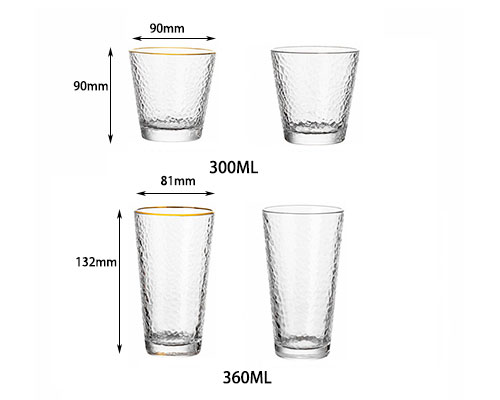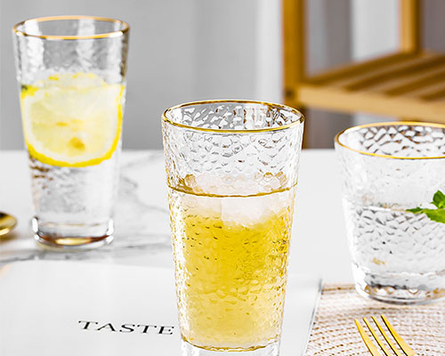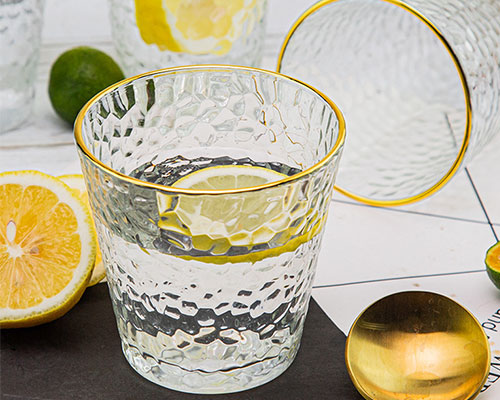 The hammered glass cups is round and smooth, like an exquisite work of art. The rim of glass cup is painted with gold craftsmanship, which is full of fashion and shines in the sun. The glass cup adopts a thick base, which is more convenient and safe to use. This hammered glass with a gold rim is very stylish and is mostly used in high-end restaurants and bars.