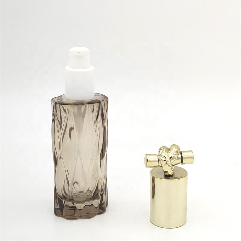 The unique luxury lotion bottle adopts diamond-shaped embossed glass material and a creative shape bottle design, and the capacity is 60ml. The empty glass bottle is equipped with pump, used for lotion packaging.