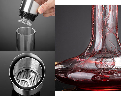 This glass decanter has a high-density mesh filter port, which can filter out the impurities and cork residues formed by the precipitation of red wine for many years, and restore the authentic taste of red wine.