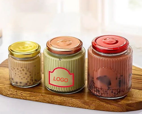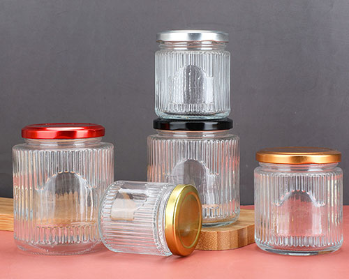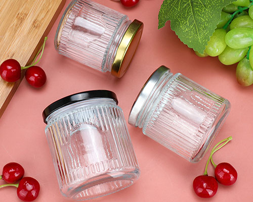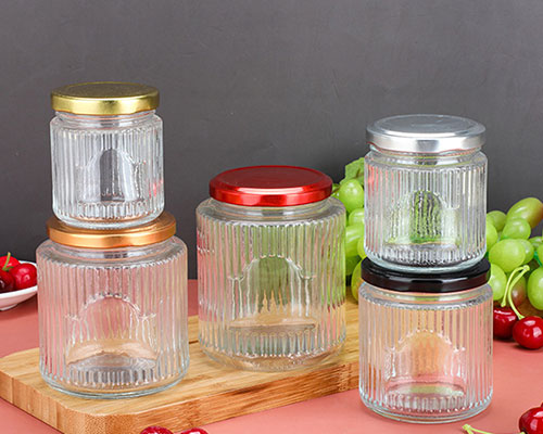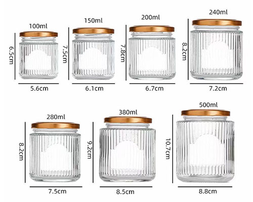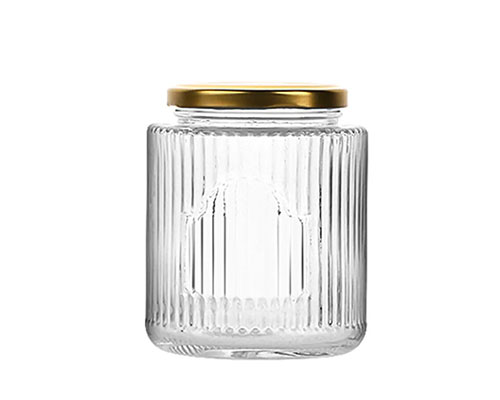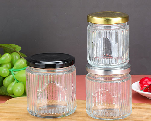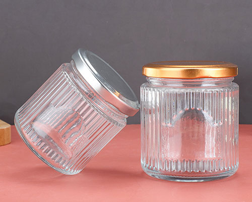 These round honey jars are designed with vertical stripes, and we produce this style of bulk glass jars in various capacities of 100ml, 150ml, 200ml, 250ml, 380ml, and 500ml. We offer metal lids for round glass jars in different colors, to provide a better sealing effect.