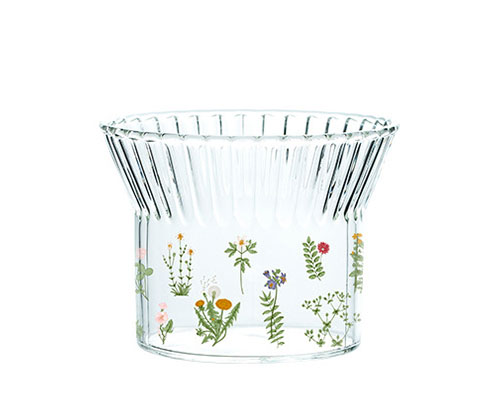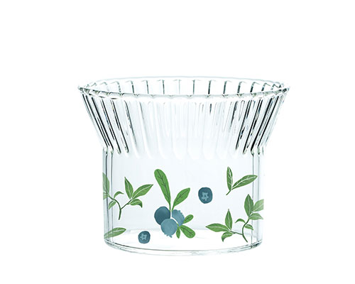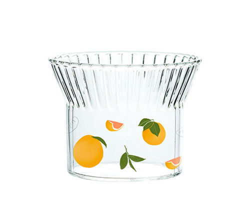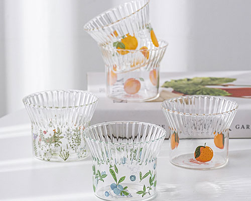 This glass is beautiful in shape, with a roasted flower pattern on the bottom half and vertical stripes on the top half. We offer mini glass dessert cups with different patterns. These glasses made of borosilicate glass can be used over and over again. They do not absorb any stains or odors. They look new every time you take them out to use.