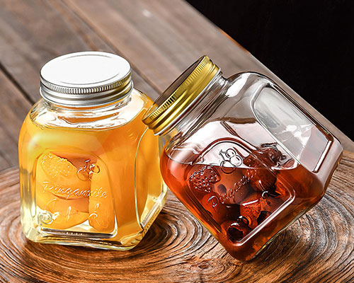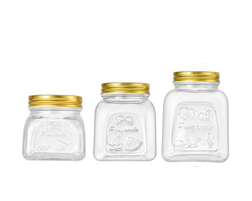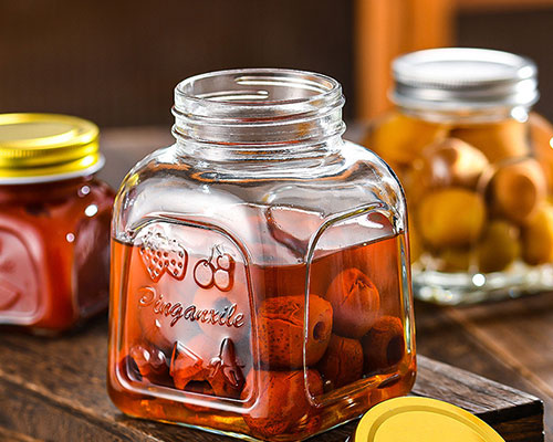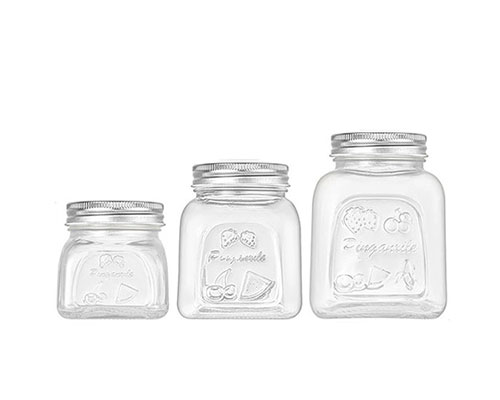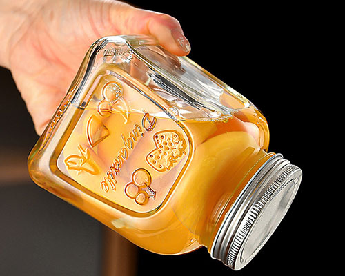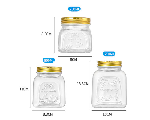 We have square canning jars in 3 capacities, 250ml, 500ml, and 750ml. The glass mason jar has a delicate fruit embossed pattern on the front, which is very beautiful and charming.