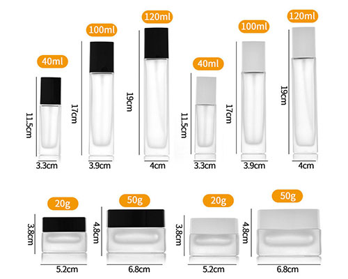 The square glass cosmetic bottle set is made of high-quality frosted glass with a high-end texture. Each glass bottle comes with a durable pressure pump as well as an ABS cap. Large diameter square frosted glass cosmetic jars come with black or white screw caps.