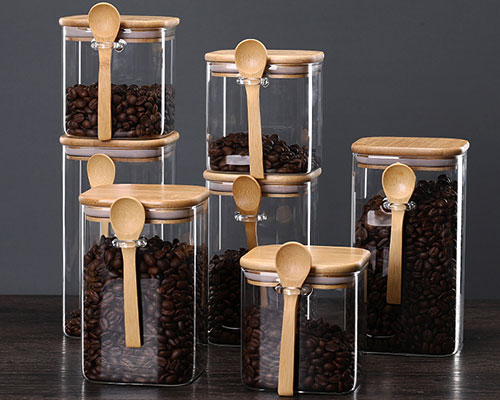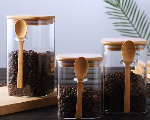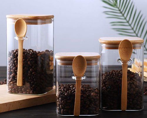We offer wholesale glass jars with lids and spoons in different shapes and sizes. These kitchen storage jars are made of high-quality clear glass, allowing you to see their contents at a glance. The wide opening makes the glass coffee jar easy to use, just lift the lid. A wooden spoon helps to remove the food inside.