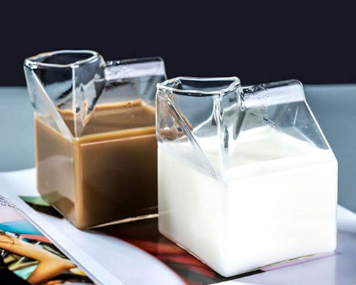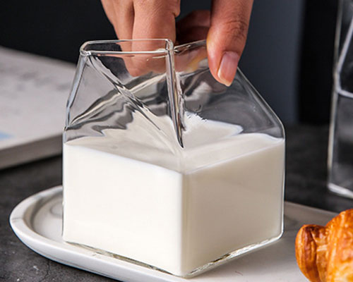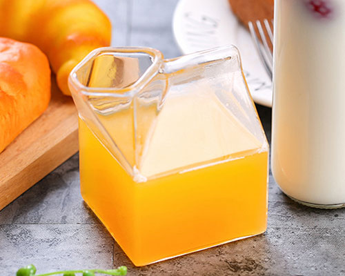 The square glass water pitcher is a crystal clear glass milk carton. The glass milk cup combines classic style with durability and practicality, it can hold 250ml of milk, coffee, hot tea, hot cocoa, cocktails, smoothies, juices and other beverages.