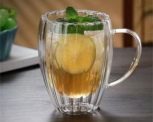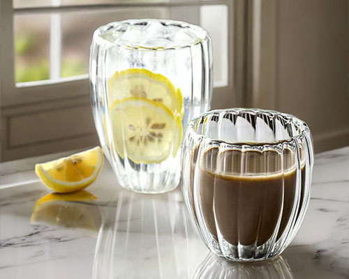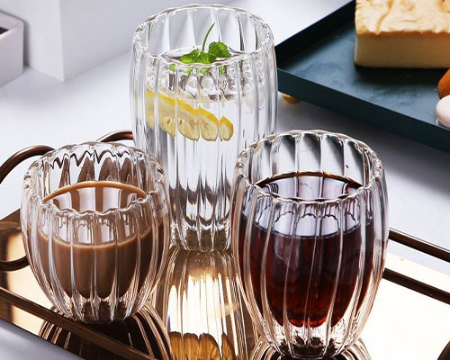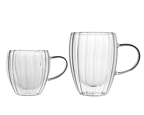 We have two shapes of double-wall coffee cups: Clear Thermo Glass Cup and Double Walled Glass Mugs With Handles. These coffee tumblers are made of borosilicate glass, which is strong and clear, lead-free and BPA-free. The double-walled vertical striped glass tumblers can withstand an instantaneous temperature difference of 180 degrees.