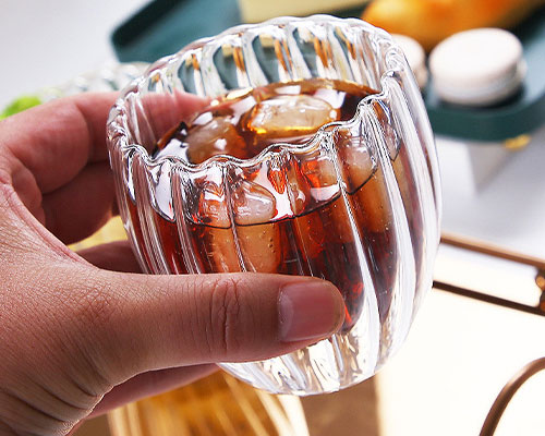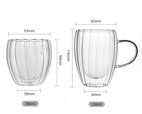 The vertical striped glass tumblers adopt a double-layer glass design, which has the dual functions of heat preservation and heat insulation. We have double-walled glass coffee mugs in two capacities: 280ml and 330ml.